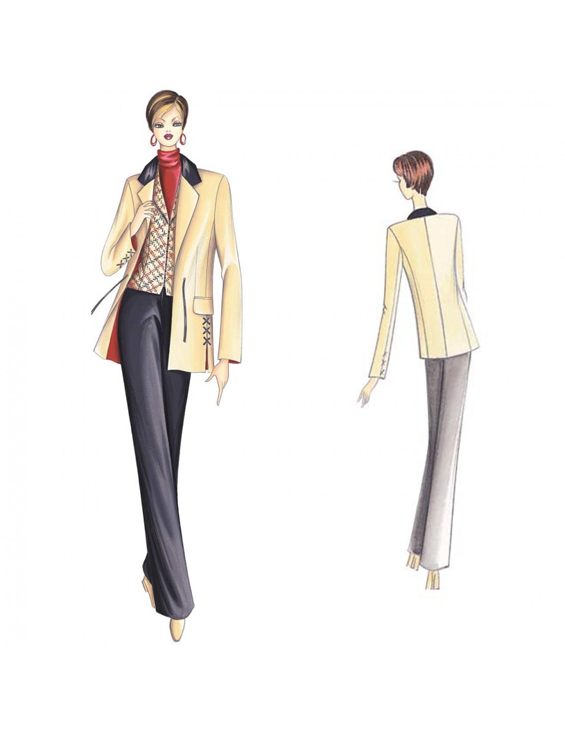 Chaqueta de una fila de botones, de corte semirecto, cuello deportivo y aberturas laterales que se cierran con cordones cruzados de piel como el sobrecuello y los lacitos que cierran la chaqueta y la manga. Tejidos aconsejables: fieltro, tweed, grisalla, vicuña, rayado. Blusa n. 8463.