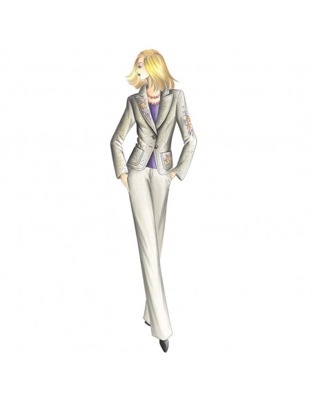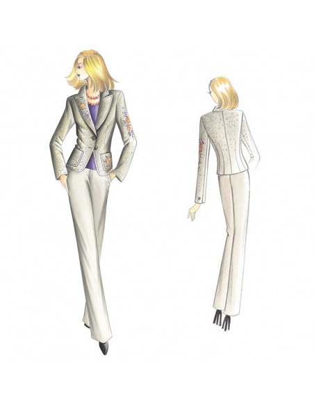 This British style single-breasted, tight-fitting jacket has romantic details. It has tapered lapels, patch pockets and a single sleeve embroidered with wool yarn. Suggested fabric: tweed. Soft straight trousers no. 8700.