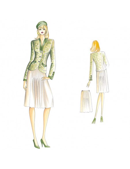 This short, form-fitting jacket has a collar and pockets with wool or velvet trim: Suggested fabric: plaid jersey or tartan. Skirt n. 1407.