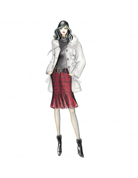 Chaquetón deportivo, de una sola fila de botones, recto, cinturón en el talle, bolsillos de parche y solapas presas con botones, cuello anillo original dotado de coulisse. Falda n. 1024.