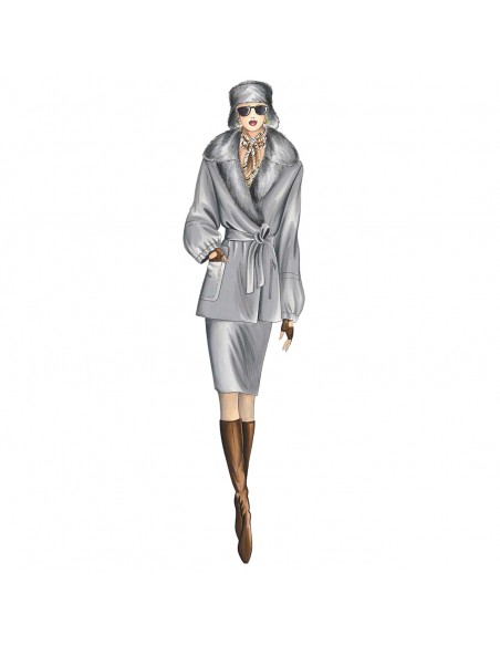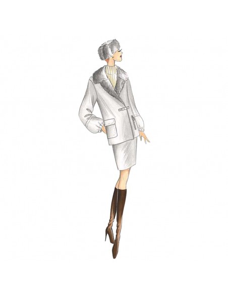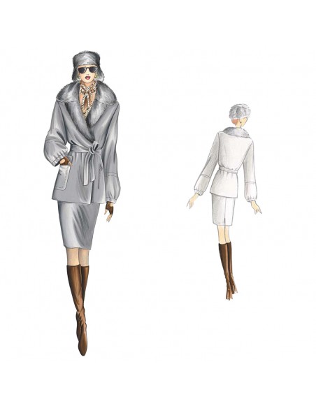 Chaquetón elegante, recto, doble cruce sujeto con tira y si se quiere con cinturón, solapa cruzada, sobrecuello ancho de puntas alargadas, mangas cortadas a la altura de 3/4 y puños fruncidos, bolsillos individuales de parche y uno en el interior con cremallera.