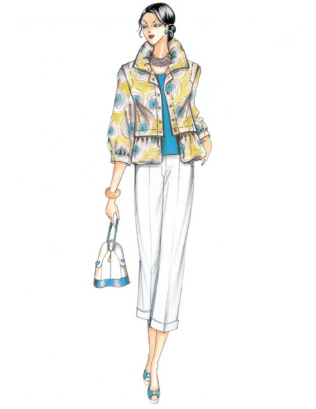 Blusón recomendable en satén fantasía o lino, cuello estilo gorguera, hombros con vuelta un poco subida, parte inferior peculiar, en tejido forrado con bolsillos interiores