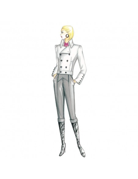 Chaquetón entre deportivo y de inspiración vintage, de doble cruce, cuello a lo Danton, mangas ligeramente fruncidas en los hombros, puños altos abrochados con pequeños botones, pequeña franja en la cintura y bolsillos interiores. Se puede hacer en denim, napa, terciopelo liso o vicuña.