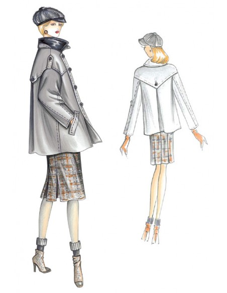 Chaquetón deportivo de una sola fila de botones, ligeramente acampanado, el amplio canesú cuadrado baja en punta por el dobladillo de detrás y crea una vuelta baja, tiras sobre los hombros, bolsillos interiores oblicuos.