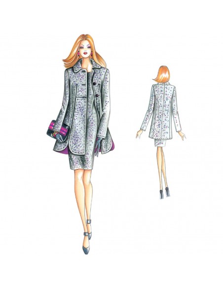 Chaqueta larga, de una sola fila de botones, acampanada, con cuello tipo camisa, cortes longitudinales y especie de redondeado en el dobladillo para formar una pequeña abertura. Se puede hacer en lana peinada o tweed, posiblemente con los perfide de piel.