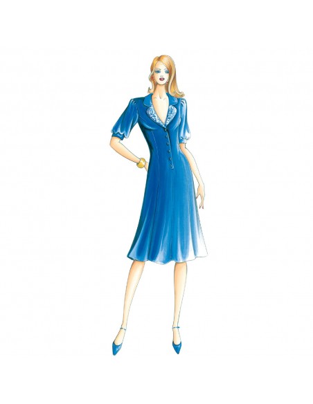 Vestido camisero modelado, dividido en telas acampanadas men la parte inferior, mangas cortas fruncidas tanto en los puños como en los hombros, cuello de solapas redondeadas, se abrocha con botones pequeños. Se puede hacer en muselina, satén, encaje sankt gallen, seda devoré.