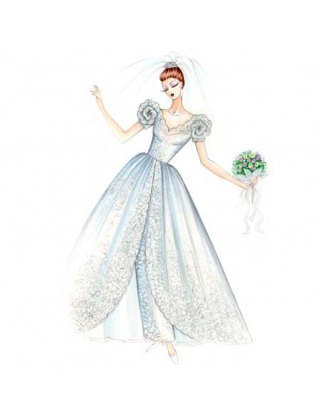 Mangas corola muy originales para el romántico vestido de encaje con amplia sobrefalda redondeada con forro de organza o satén. A realizar también enteramente en organza.
