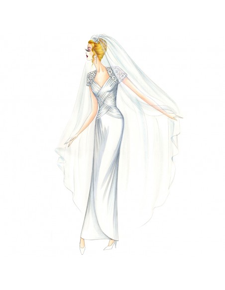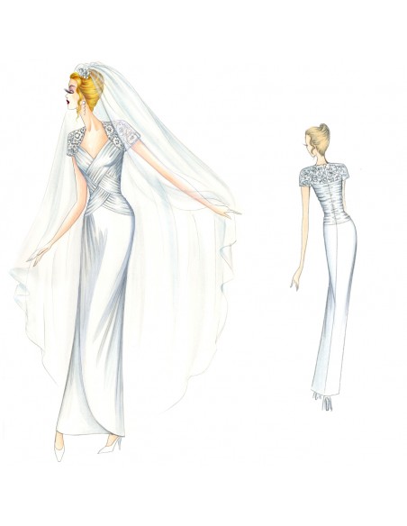 Los drapeados se entrelazan y mueven el corpiño del vestido moldeado de línea recta con panel redondeado sujeto a un lado y escote corazón. Puede confeccionarse en crepé, jersey de seda o georgette y encaje de Alençon.