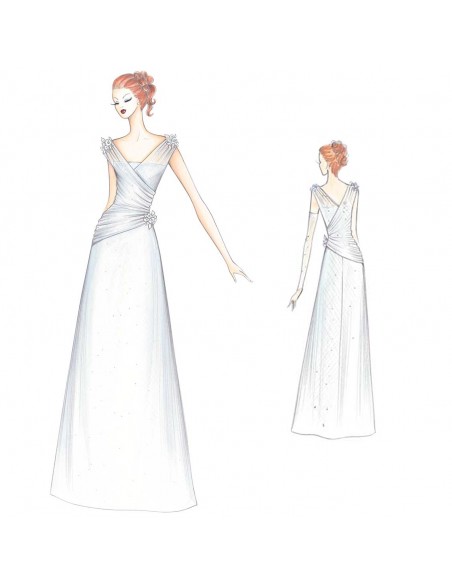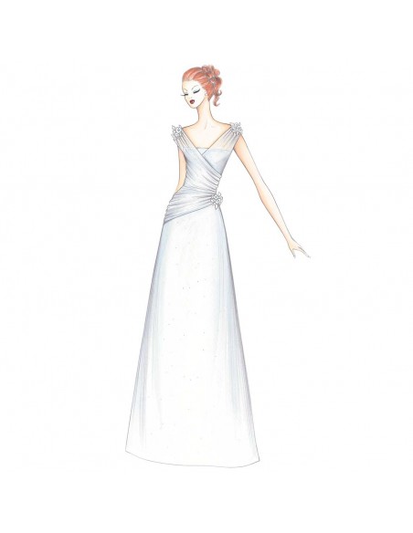 Toda la pureza del tul en seda para un vestido de corpiño asimétrico, de doble cruce y un drapeado espeso que descubre el corsé escotado debajo; falda de corte simple, ligeramente acampanada, de raso forrado de tul.