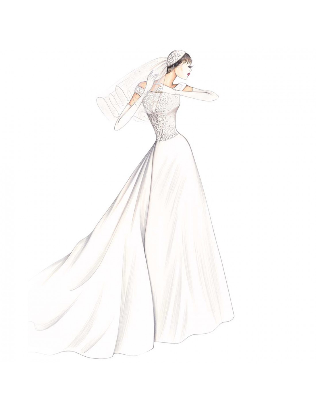 Se puede realizar en encaje Chantilly o Alençon un corpiño ajustado, de escote amplio para un vestido que se abre en la parte inferior y que tiene una cola amplia que realza la falda, movida con pliegues. Se recomienda en tafetán o ratzmir.