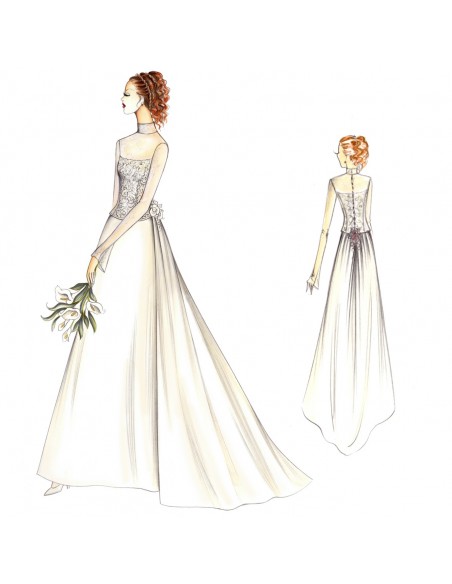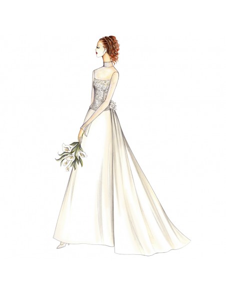 Refinado vestido de novia de dos piezas: el corpiño moldeado puede ser de encaje con canesú, cuello alto y mangas ajustadas acampanadas en las muñecas de tul o gasa; la falda acampanada tiene un rico panel fruncido en la espalda que crea una cola.