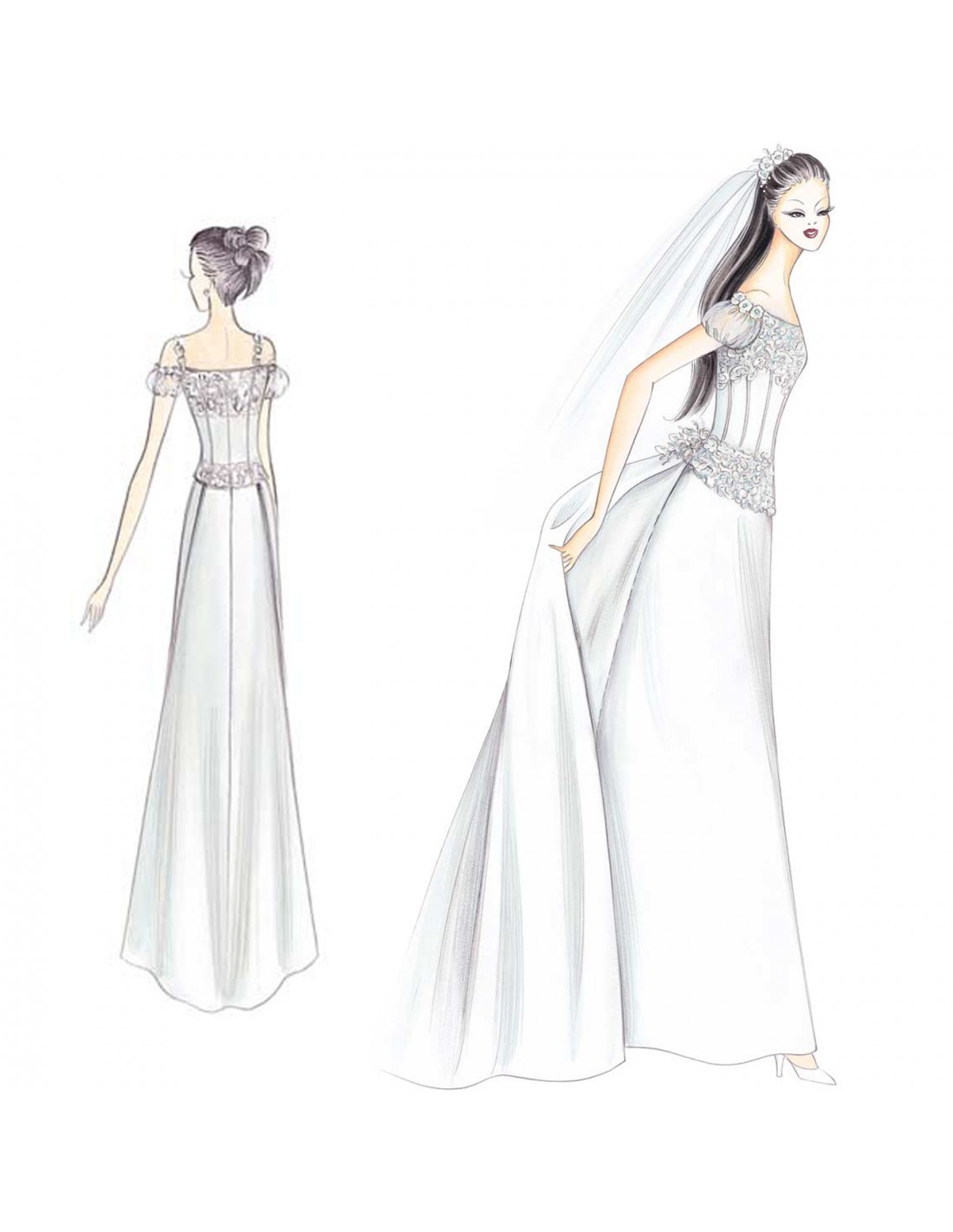Vestido refinado que se puede realizar en micado, gazar u organdí triple, de bustier adornado con bordes amplios de encaje en el cuello y en la parte inferior, la falda acampanada tiene una pequeña cola.