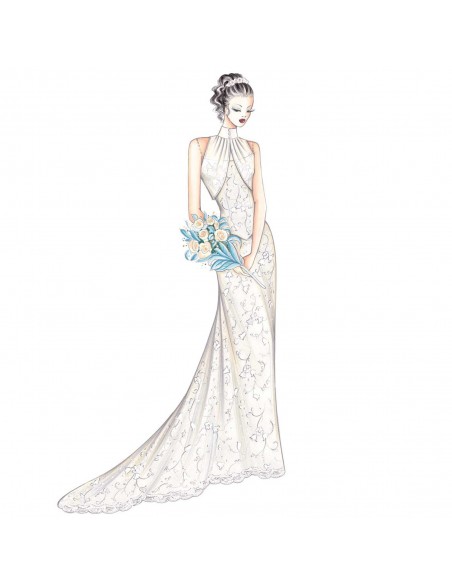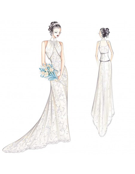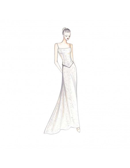 Tres piezas separadas para el vestido refinado que se puede realizar en encaje Chantilly o tul bordado: falda tipo sirena, bustier escotado de tirantas pequeñas y parte inferior de punta y una pequeña torera sin mangas a la americana en chifón de cuello ceñido que forma un ligero fruncido y una parte redondeada delantera.