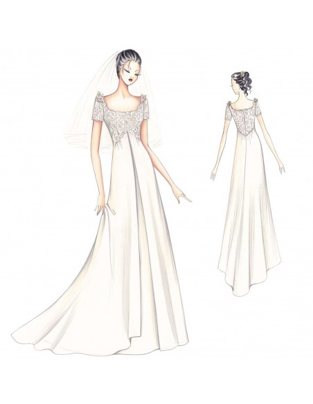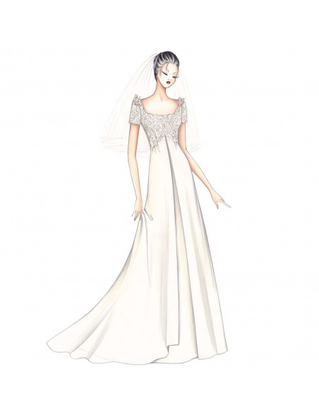 Vestido imperial de corte en forma de V que baja por detrás, escote amplio redondeado y mangas cortas de vuelta, la falda acampanada de cola tiene una sobrefalda con abertura central. Corpiño que se puede realizar en encaje Alençon o macramé y crespón georgette.