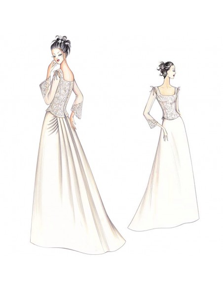 Encaje fino Chantilly para el bustier escotado de inspiración renacentista, mangas 3/4 acampanadas, desprendibles y sujetas a la vuelta con lacitos que forman aberturas pequeñas; la falda acampanada se puede realizar en tafetán y está recogida por un drapeado suave trasero, los pliegues mueven la cola.