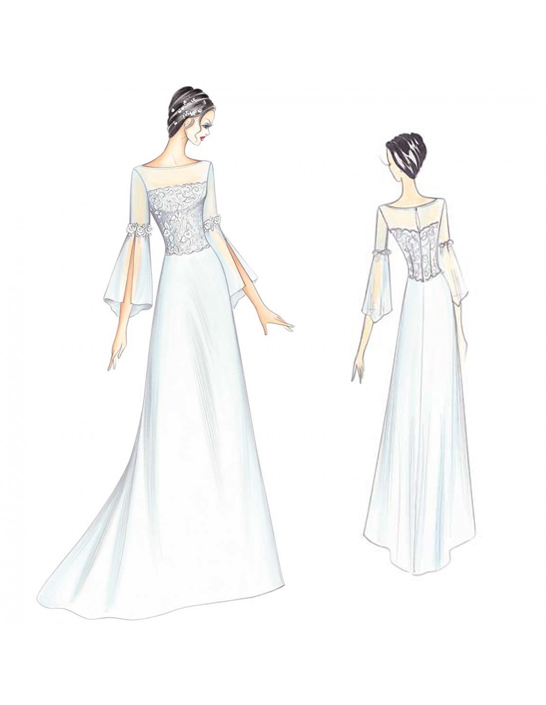 Bordes de flores adornan las mangas de volantes anchos tipo pañuelo, con abertura, bustier en encaje que se sobrepone al corpiño en chifón o en organdí ligero, de cuello barca; falda acampanada simple y de cola ligera, en mikado o en organdí.