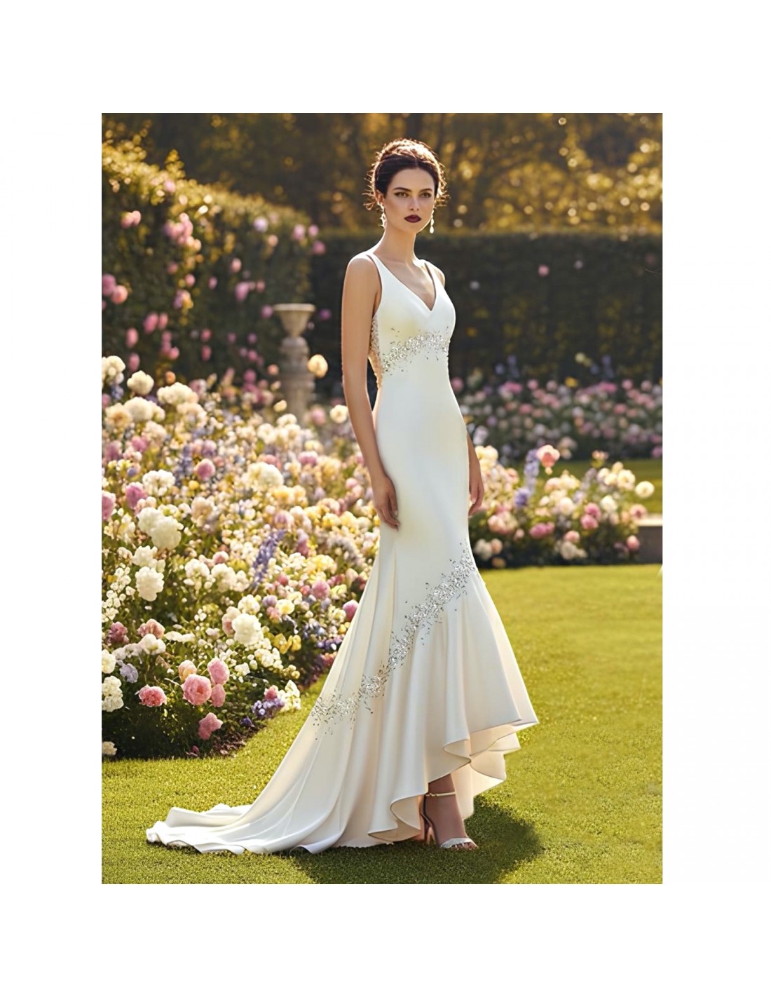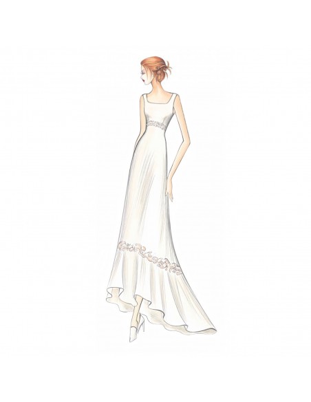 Se siguen unos a otros bordes de encaje o pedrería en el vestido fino, modelo sirena, de volante ancho en la parte inferior. Se puede realizar en raso Charmeuse o chifón. El patrón incluye el corpiño tanto en versión con escote cuadrado como en V.