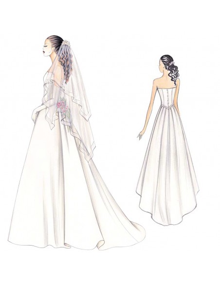 Vestido juvenil y romántico para realizar con o sin manguitas abombadas, corpiño decorado de encaje y falda adornada con cola trasera. Tejido recomendable: raso, organdí o mikado.