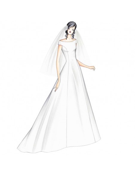 Vestido fino de princesa que descubre los hombros y se cierra con cordones. Falda que se mueve con pliegues traseros grandes, sujetos con flores. Se puede realizar en mikado, gazar, organdí triple o raso Duchesse.