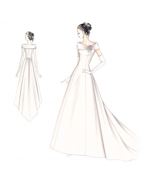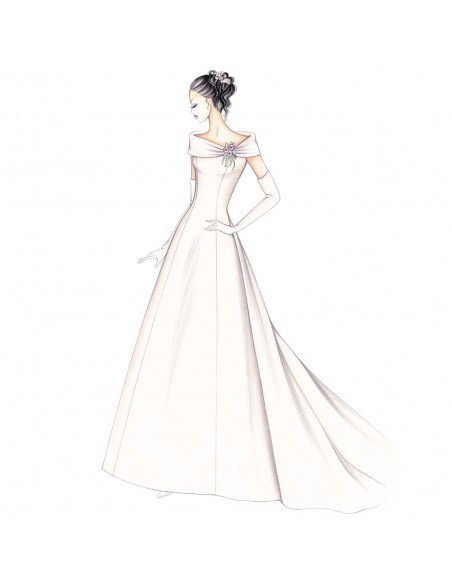 Enmarca los hombros un cuello suave cruzado y drapeado, cerrado con flores, vestido de princesa que se mueve por detrás con pliegues grandes y fruncido que se abren en la cola. Se puede realizar en raso Duquesse o tafetán.