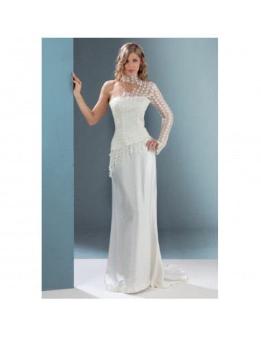 Es elegante y de realeza un redingote largo bord-a-bord de telas acampanadas en la parte inferior, escote corazón que descubre el encaje del vestido y mangas con puños de volante y abertura pequeña. Recomendable en mikado. Una aplicación de encaje decora el escote del vestido princesa sin mangas, escote cuadrado. Se puede realizar en mikado.