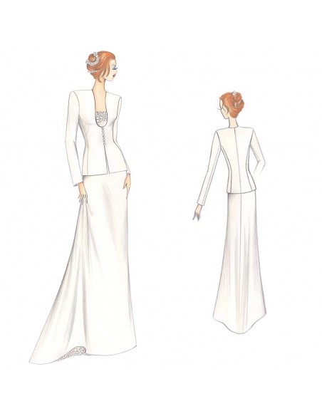 Vestido semirrecto con cola de sirena trasera, se puede realizar en crespónsatín, chaquetilla muy escotada y hacia un lado, sujeta con botones y ojales sueltos.
