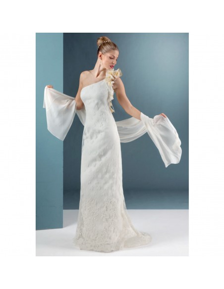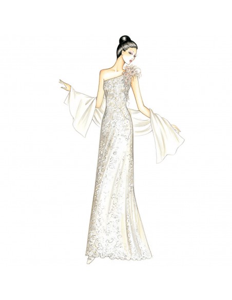 Vestido escotado, de fina elegancia minimalista, tipo sirena. Se puede hacer en tul bordado o encaje macramè.