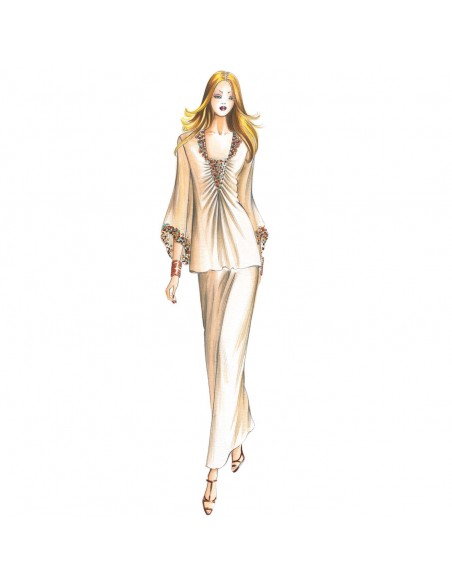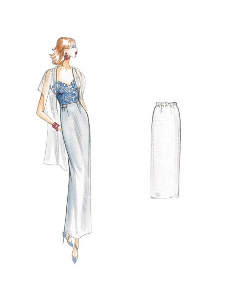 Falda larga y recta, talle marcado por la pequeña coulisse. Casaca n. 2228.