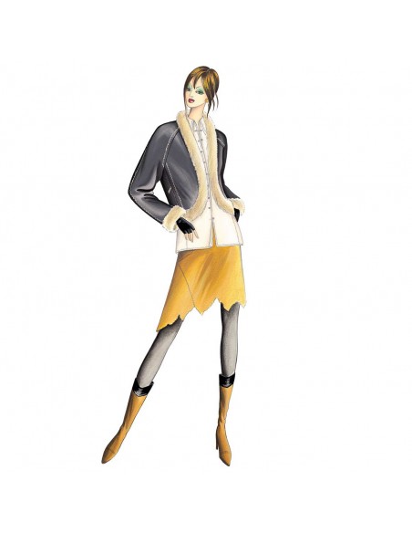Falda acampanada, borde sin motivo y de forma irregular, se inclina hacia la cadera con cortes diagonales que destacan por el zig-zag, se puede hacer con piel afelpada o piel. Camisa n. 8859. Chaqueta n. 8866.