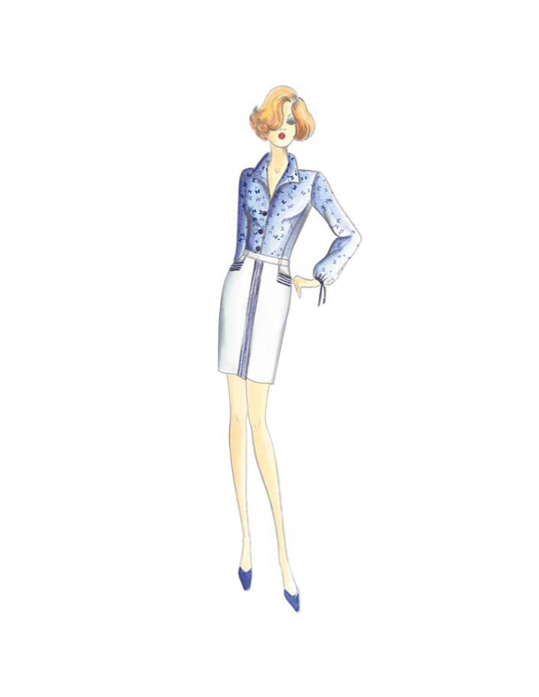 Falda recta, bolsillos internos y abertura central con ribete azul oscuro sobre lino blanco o tejido gabardina.