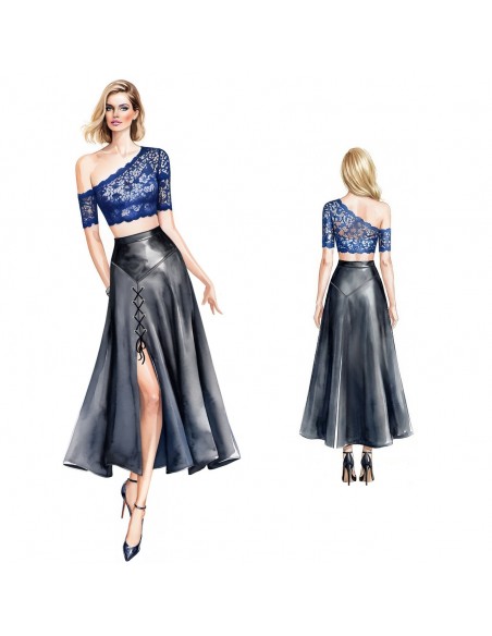 Falda acampanada dividida en dos partes, con basquín y abertura alta cerrada con cordones.