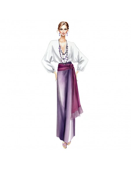 Falda larga y suave de corte recto con basque, adornada con una faja con flecos que se ata a un lado. Tejidos recomendados: satén, jersey de viscosa o, para una versión de noche, tejido con lentejuelas. Blusa n.º 8125.