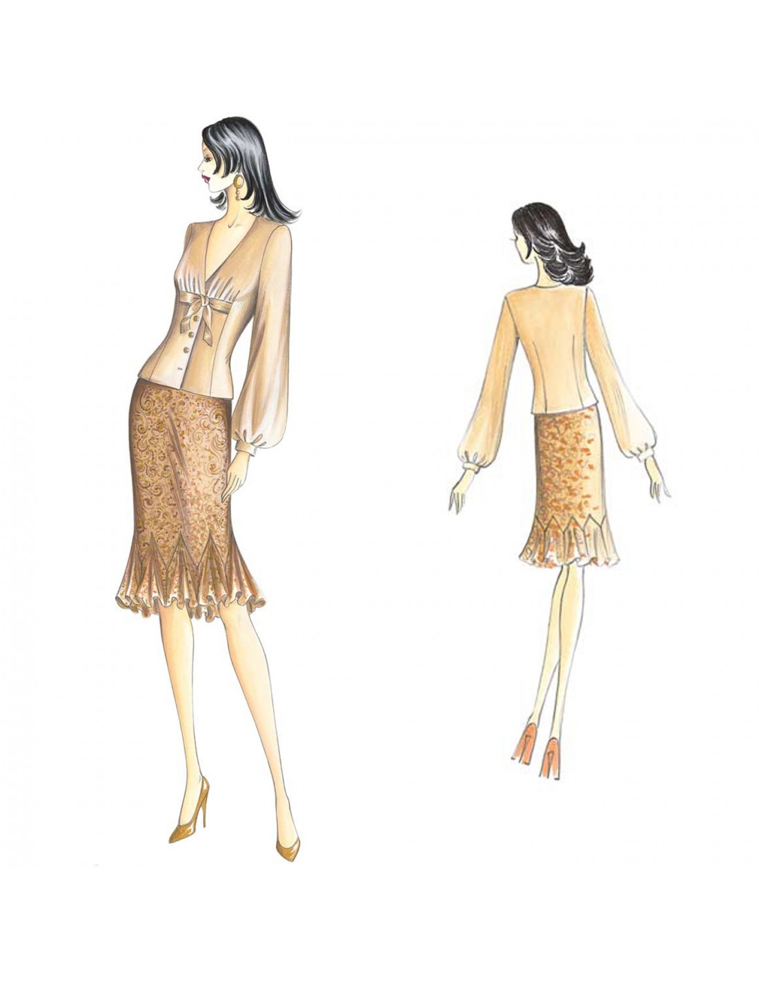 This straight skirt has a pointed motif in the hemline into which chiffon volant ruffles are inserted. Suggested fabric: damask or embroidered lace. Blouse n. 1501.