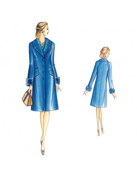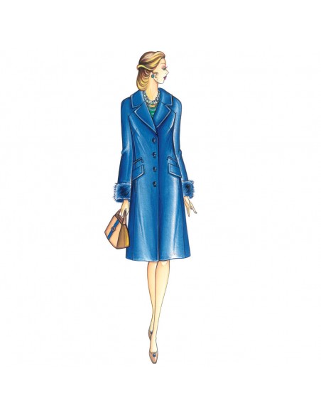Abrigo semi-modelado, de una sola fila de botones, con mangas raglan, bolsillos parcheados cerrados con zip y solapas aplicadas sobre los bolsillos interiores. Se puede hacer en paño, vicuña, velour.
