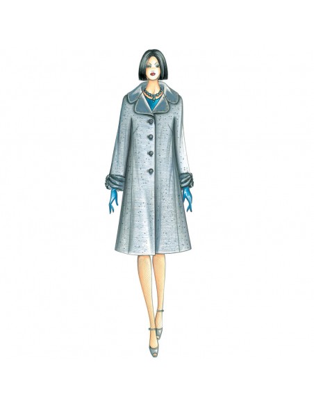 Manto en forma de trapecio, con mangas tipo kimono, cuello de puntas redondeadas, puños originales con pliegues sueltos que se pueden hacer de visón, de terciopelo o de la misma tela. Tejidos recomendados: tweed, velour, lana peinada. Vestido n. 2936.