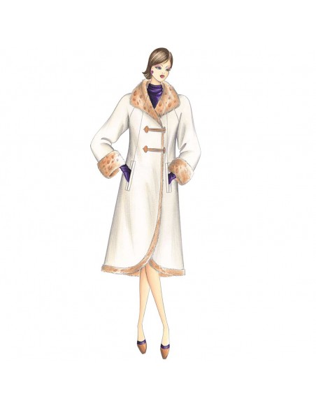 Abrigo a redingote, semi-ancho, se abrocha con alamares, se puede hacer con velour, mangas ranglán, cortes oblicuos donde se colocan bolsillos sin solapa, parte inferior redondeada, bordes, cuello y puños de piel.