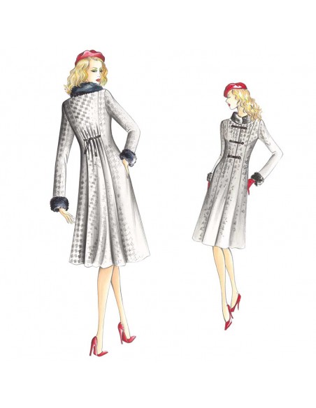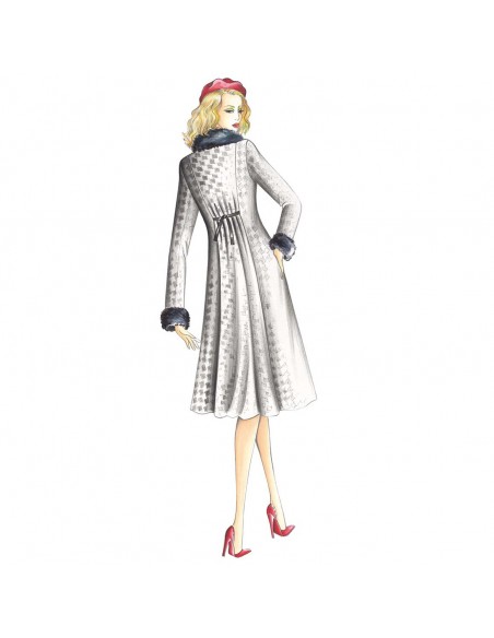 This 1960’s-style redingote has gathering at the back. It has a ring collar and fur cuffs with a leather or velvet sash. Suggested fabric: hound’s tooth check, tweed or soft light woven fabric.