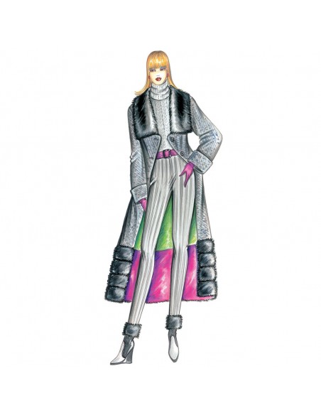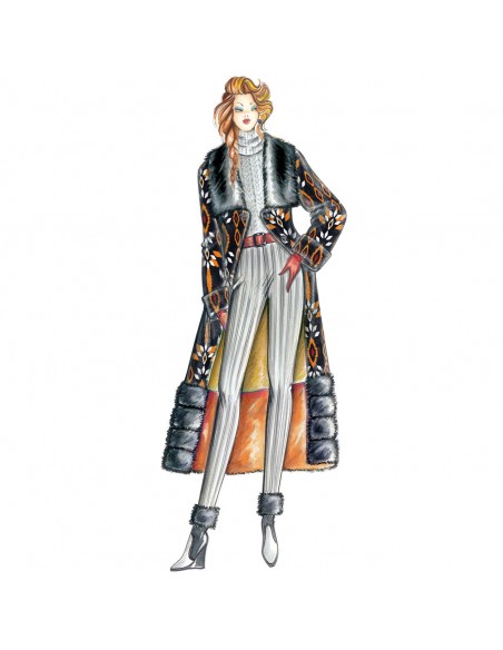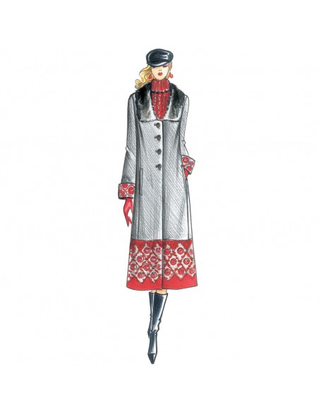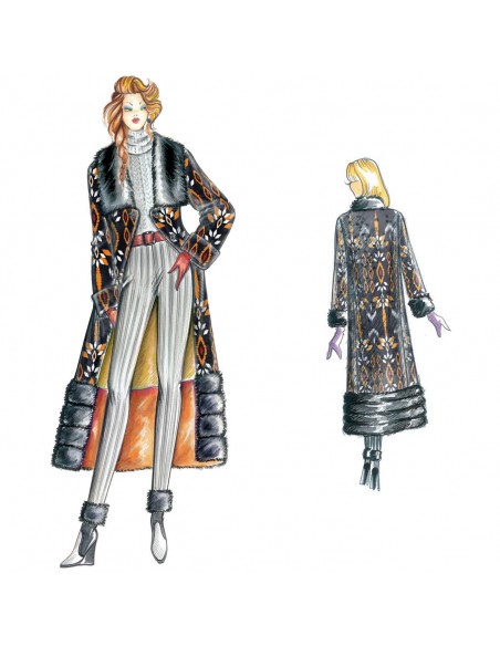 Maxi-abrigo de una sola fila de botones, acampanado, de cuello cruzado y hacia abajo, se puede hacer de visón, al igual que el borde alto de la parte inferior. Tejidos recomendados: lana fantasía Jacquard o velour, incluso el borde en tejido pespunteado.