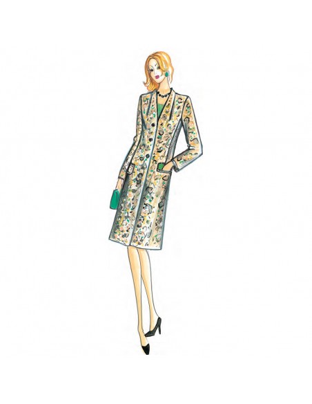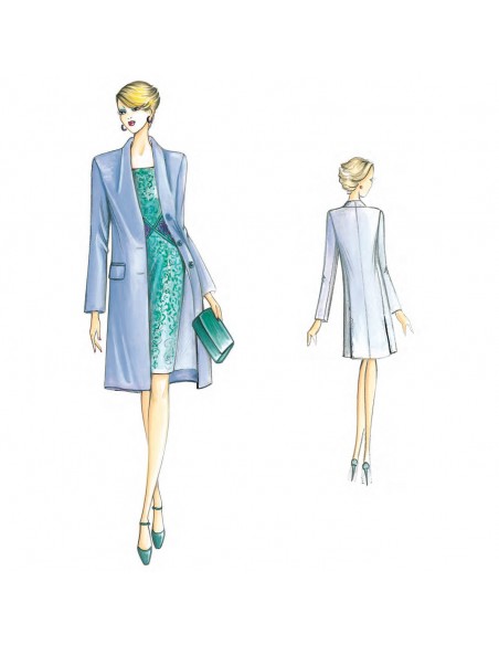 Abrigo de una sola fila de botones, cuello realzado para sujetar pinzas sueltas y aberturas por detrás. Tejidos aconsejados: gabardine, terciopelo, brocado o lana fantasía. Vestido n. 6017.