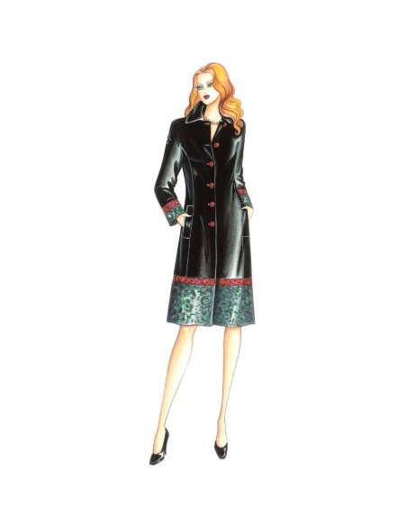 Abrigo en velvetón o punto doble, se puede hacer en dos versiones, bien con borde en lana jacquard o brocado con pasamanería, bien con franjas de lana, mangas kimono y cuello tipo camisa.