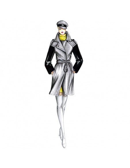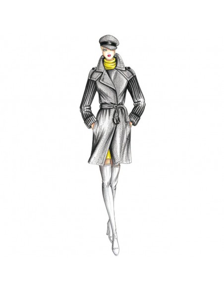 Mini abrigo semi-modelado, el cuello de solapa se abrocha con botón sobre el cuello redondo, mangas de vuelta baja que se pueden hacer en punto canalé o ecopiel.