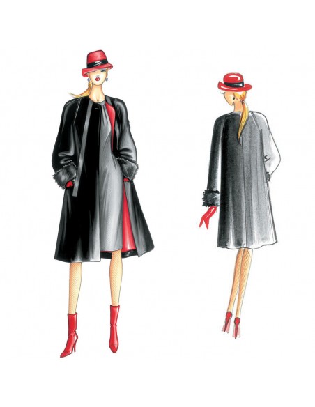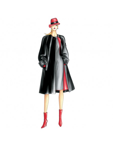 Manto en forma de trapecio, de cuello barca, mangas semi-ranglán con una sola pinza sobre los hombros, y de corte diagonal marcado por borde de piel. Recomendable en lana tratada o tejido mezclado. Vestido ceñido n. 2909.