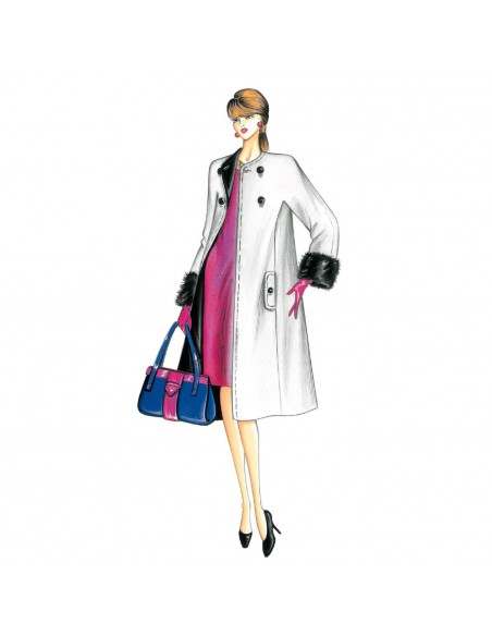 Manto acampanado, de doble cruce y cuello barca, mangas kimono y bolsillos interiores con solata levantadas y presas con botón, parte trasera con dobladillo. Se puede hacer en cachemir doble o velour. Vestido 3312.