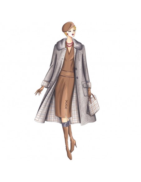 Abrigo de una fila de botones, acampanado, cuello amplio que se puede realizar en piel, mangas quimono con bajo-manga, puños recargados y solapas aplicadas a los bolsillos de parche.Tejidos aconsejables: cachemir double-face o tweed forrado en tartán.