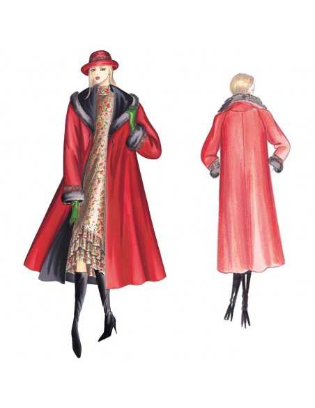 Abrigo de una fila de botones, tipo trapecio, cuello amplio y cruzado, bordeado en piel como los puños, mangas semi-raglán bordadas al fondo. Se puede realizar en velludillo, cachemir o moer. Vestido n. 7160.