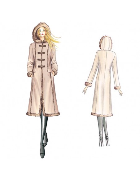 Redingote que recuerda los años 70, con una sola fila de botones, se abrocha con tiras de velcro, cosidos marcados, capucha, mangas de vuelta, puños ribeteados y bolsillos interiores con solapas. Se puede hacer de ante satinado, ante ecológico o loden.
