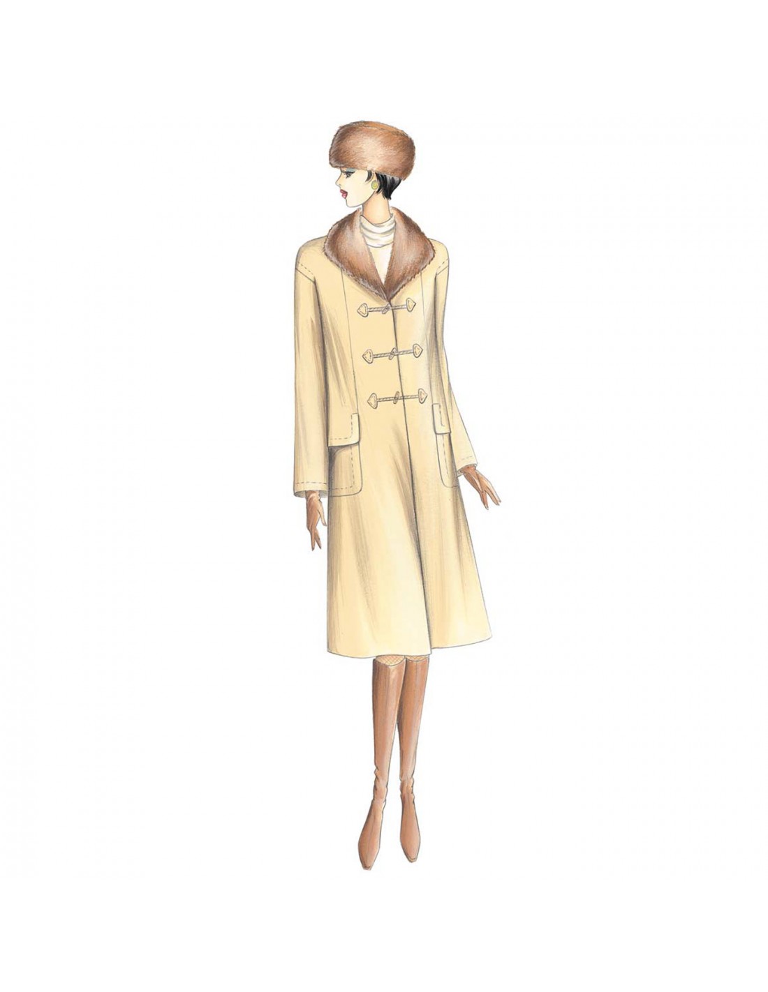 Abrigo de una sola fila de botones, ligeramente acampanado, se abrocha con alamares, solapas puestas en el costado, mangas de vuelta baja y cuello de piel. Se puede hacer con paño, velour, loden.