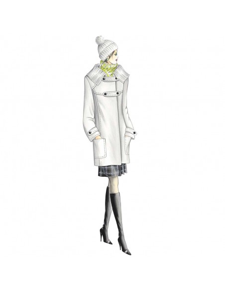 This somewhat straight Montgomery duffle coat closes with double crossover secured with rounded strips. It has a broad offset collar that can be made of ribbed knot or fabric (the pattern includes both versions). Suggested fabric: woven fabric or loden.