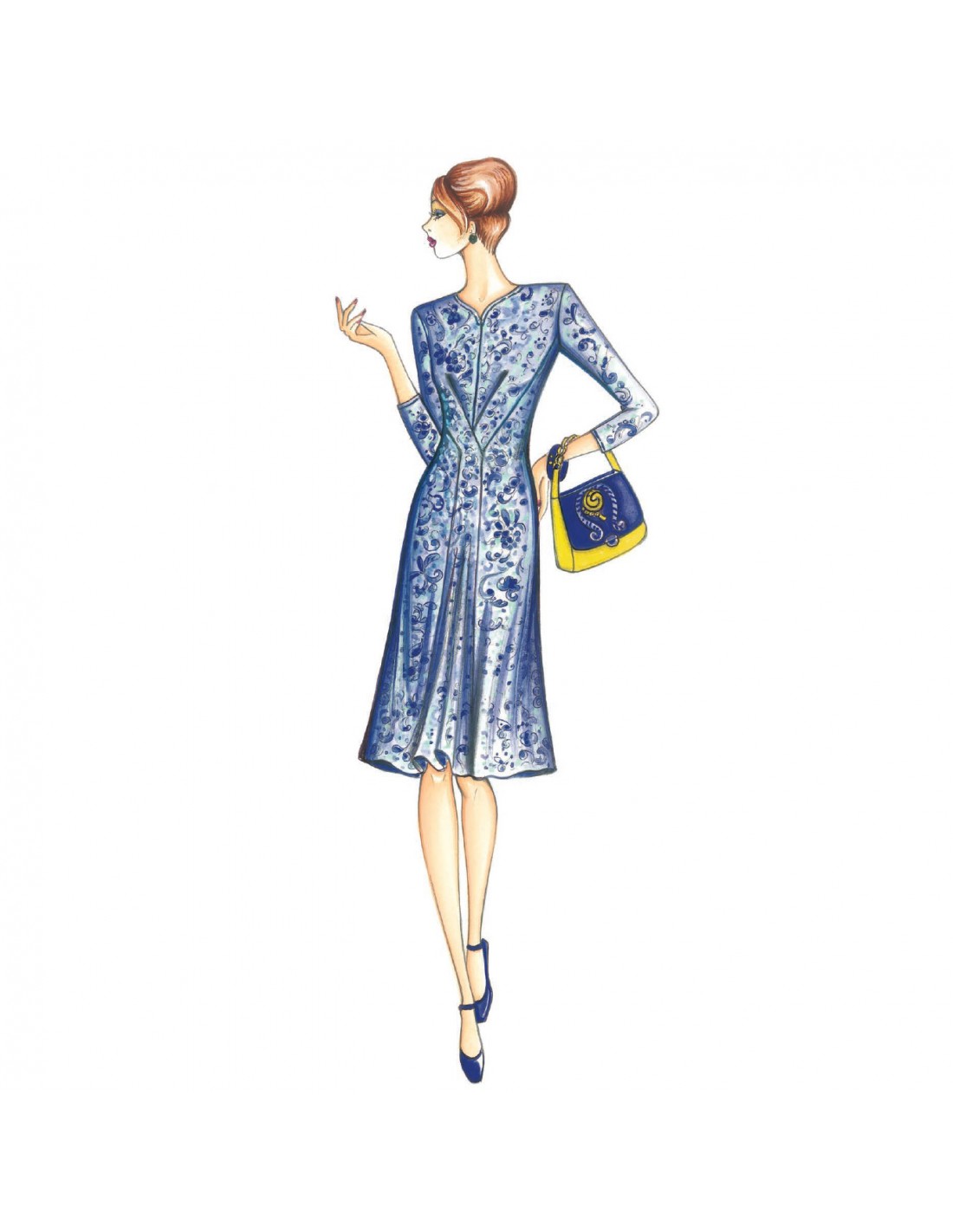 Vestido de corpiño modelado, sus cortes marcan la silueta, la falda de telas se mueve en la parte inferior, de cuello redondo en forma de gota y mangas ¾. Se puede hacer en punto fantasía o crespón.