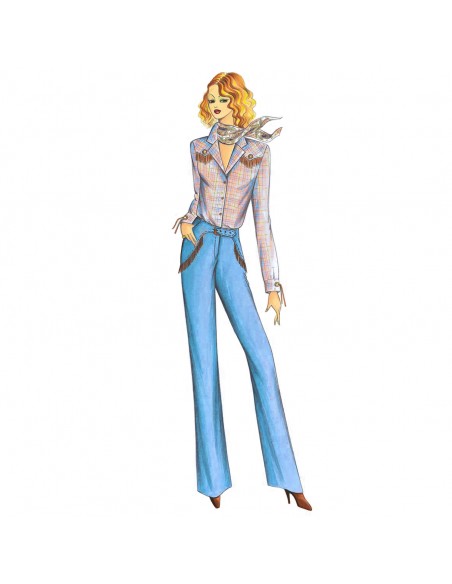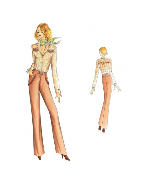 Pantalones tipo vaquero ligeramente acampanados, motivo de bolsillos perfilados que llevan franja y pequeño cinturón con hebilla. Se recomienda en tejido fustán o en piel lisa. Blusa n. 9290.